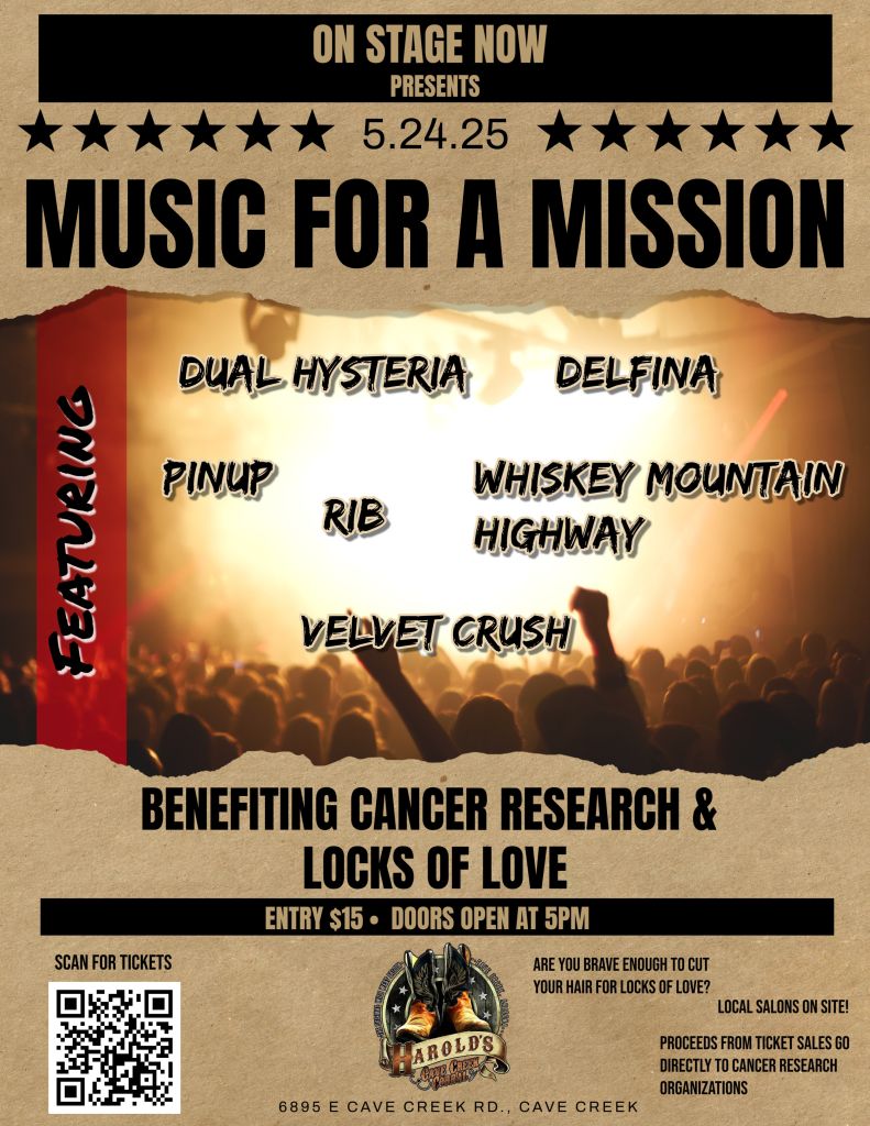 This is an all-ages fundraiser & concert event, presenting local music from Pinup, Dual Hysteria, Delfina, RIB, Whiskey Mountain Highway and Velvet Crush. This event is intended to raise funds for cancer research in Arizona. Donations are encouraged. We will also be offering free haircuts to anyone who wishes to donate their hair to ”Locks of Love.“ (6 inch min)
