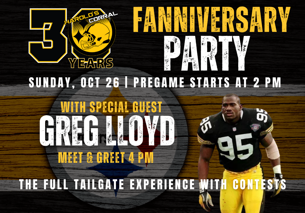 Harold’s Corral Black & Gold Zone (Heinz Field West) 30th Fanniversary Party With Special Guest: Greg Lloyd #95 On Sunday, October 26th, Harold’s Corral celebrates 30 years of the Black & Gold Zone, officially recognized by the Pittsburgh Steelers as the best Steelers bar in the country. This is more than a watch party — it's a family festival, fundraiser, tailgate celebration, and Steelers Nation Cave Creek. Pre-Game Festivities start at 2 pm Tailgate Party – backyard grilling, kielbasa, and cold drinks. Live Polka Band –fan sing-alongs and fight songs. Game Day Challenges: Field Goal Contest – by age group, hosted by Danny P Cornhole Challenge – classic tailgate fun [...]